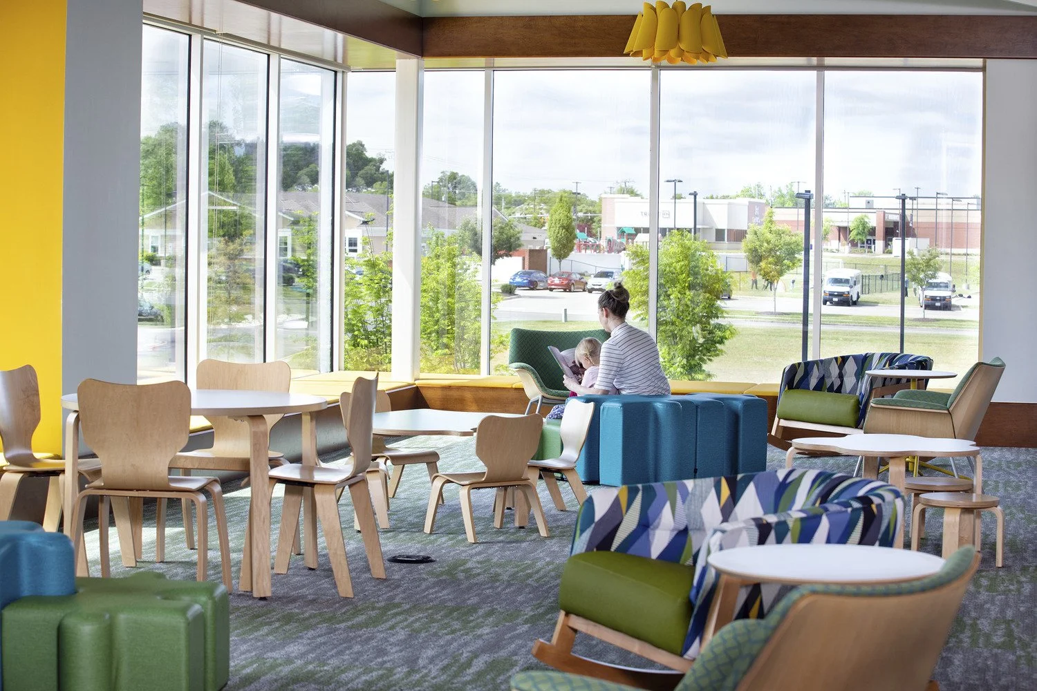 On the first floor is the reading area, quiet study rooms, public computers, and periodicals, as well as a large meeting room, public restrooms, and the administrative wing. On the upper floor is the children’s areas, the Teens space, a Digital Media Lab, a Creative Commons and a series of small conference and study rooms.