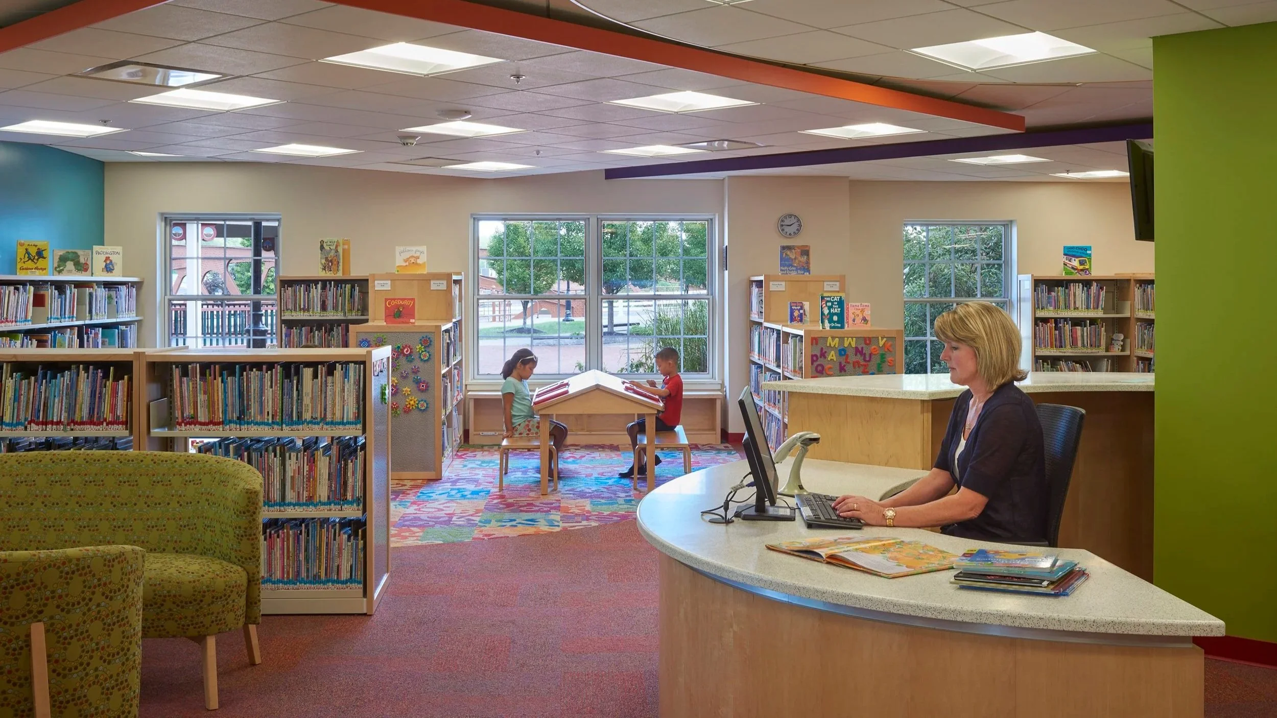 The Fairport Library renovation includes increased flexible space to the children’s area, a new teen study room and fulfills the library's mission of equal access to resources, promoting lifelong learning and being an integral and cooperative part of the community. Tappé Architects designed a comprehensive renovation to the 25,000 sqft Library. Located in retail space on the basement level of a 1970s small-town shopping mall, a completely new look was combined with much-improved access to daylight and entrance on the Erie Canal. A “Living Edge” strategy was developed, placing the primary patron spaces on the perimeter with the collections relocated concisely on the interior. Teens and children spaces are infused with new identities and technologies. The patron service points were reinvented for efficiency and to improve the welcoming quality while supervising relocated entrances.